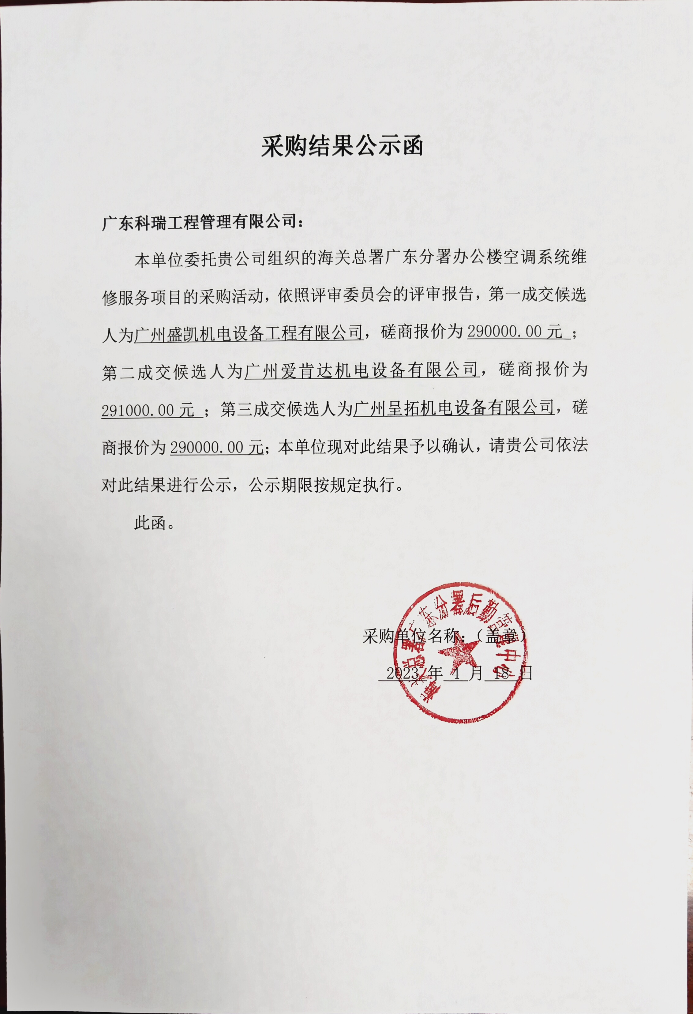 廣東科瑞工程管理有限公司受中華人民共和國海關(guān)總署廣東分署的委托,于2023年4月就海關(guān)總署廣東分署辦公樓空調(diào)系統(tǒng)維修服務(wù)項(xiàng)目競(jìng)爭(zhēng)性磋商進(jìn)行采購。現(xiàn)就本次采購的中標(biāo)(成交)結(jié)果公告如下:
